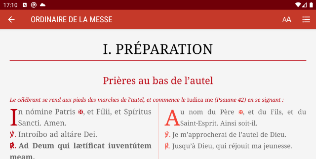 Les pictogrammes, en haut à droit, permettent de changer la tailles des polices de caractères () et d'accéder directement à une des parties de la Messe ().